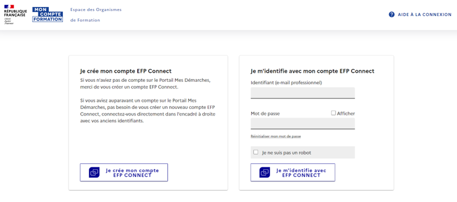 Si vous avez déjà un compte sur le portail Mes Démarches, et que vous êtes habilité à EDOF, il n’est pas nécessaire de créer un compte EFP Connect et de vous (re)habiliter à EDOF. Vous pouvez utiliser vos identifiants habituels pour vous connecter à votre espace des organismes de formation.